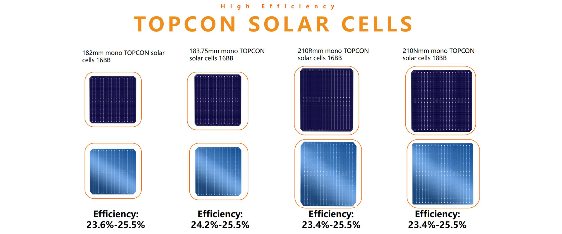 Offer efficiency from 23.0% to 25.5% , size from 182mm 10BB to 210mm 18BB